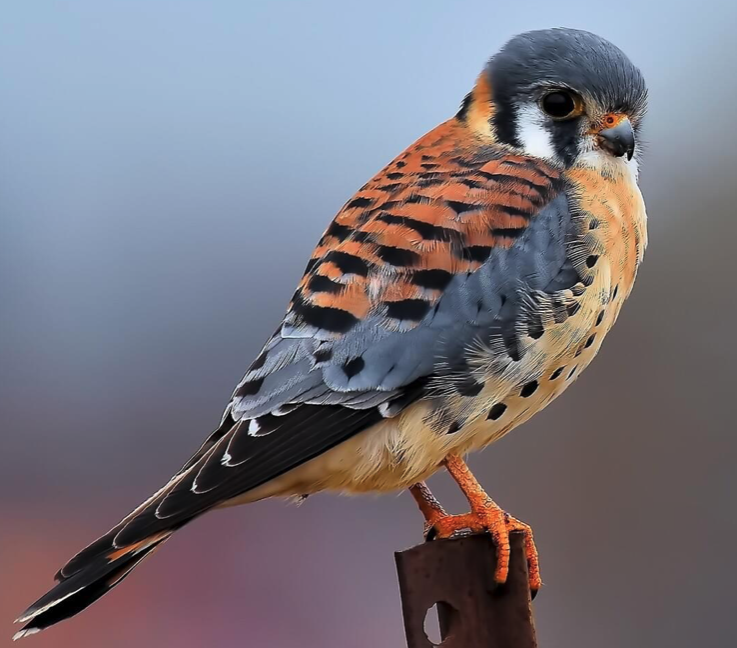 The American Kestrel is the smallest falcon in Ontario and is roughly the size of an American Robin. American Kestrels falcons males and females look different. Alternate name, the Sparrow Hawk. They will take birds of that size right out of the air. To catch prey they will hover in the breeze from a relatively low height. Diet includes insects, invertebrates, small rodents, and birds.