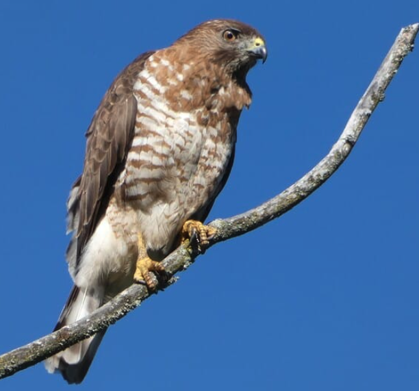 Broad-winged Hawk breed range is in Southern Ontario. Along the shores of The Great Lakes and forests in both the Spring and Fall each year. Broad-winged Hawks migrate in large flocks are called “kettles”.