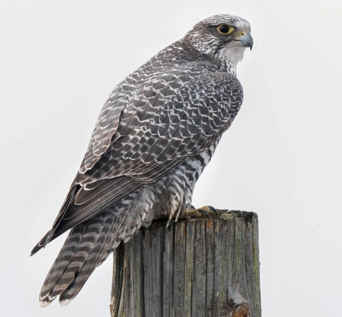The Gyrfalcon, also known as the Gyr, is the largest falcon in Ontario. Birds of the Arctic, and breed on the sides of cliffs in Northern Canada and Alaska. Gyrfalcons range in colour from almost entirely white to very dark. Males and females show no color differences. Females are larger and bulkier than males. They migrate south to Ontario from the high Arctic. Diet include hares, squirrels, young foxes, lemmings, songbirds, shorebirds, seabirds, waterfowl, and even other raptors.