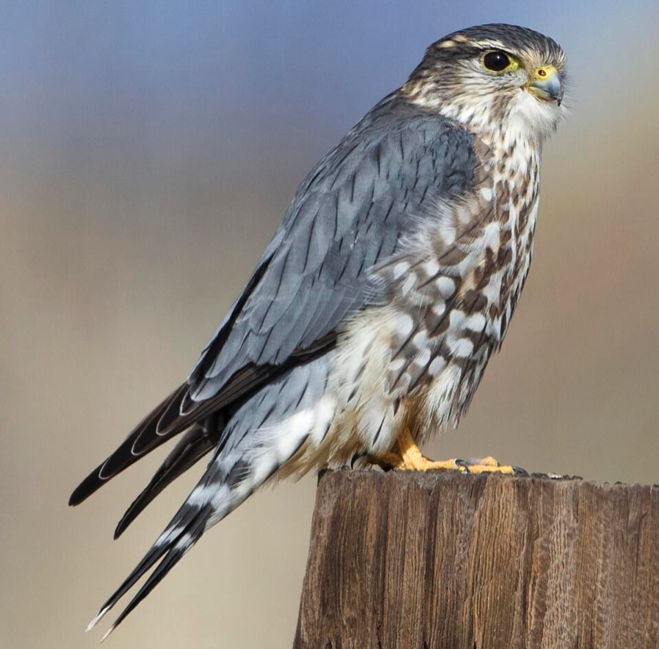Merlin are small and are widespread across Ontario. They are not that common to observe. Habitat includes shrublands, grasslands, boreal forests, parks, cemeteries, coastal areas, and near rivers. Merlin migrate and move around. Mated pairs can work cooperatively, with one driving prey right into the claws of their partner. Merlin diet includes smaller birds sparrows, larks, pigion and insects, bats, voles, reptiles. They reuse other birds’ abandoned nest.