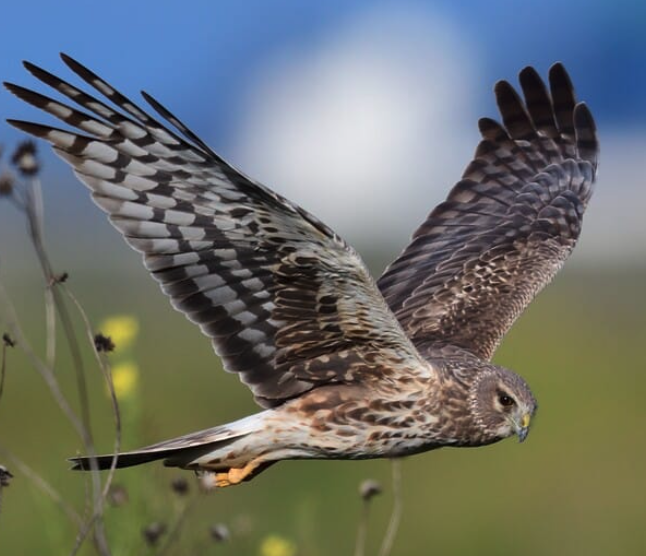 The Northern Harrier is easily identifiable by its owlish facial appearance. Harrier is found in most of Ontario during the breeding season and in far southern Ontario year-round. Live in marshes, fields, and other wide-open areas. Northern Harriers hunt low over fields and marshes, gliding low to the ground. Harriers rely on their sense of hearing for hunting. Their diet consists of small mammals, birds, and occasionally insects.