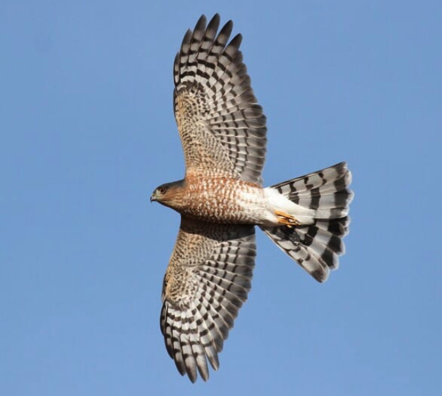 The Sharp-shinned Hawk is the smallest hawk in Ontario, with a breeding range in most of Ontario. Though in Southern Ontario they can be found year-round. Sharpies migrate north to Canada and Alaska to breed each year, and south to Central America in the winter time. They are commonly seen stalking backyard feeders, preying on small birds and other small animals.