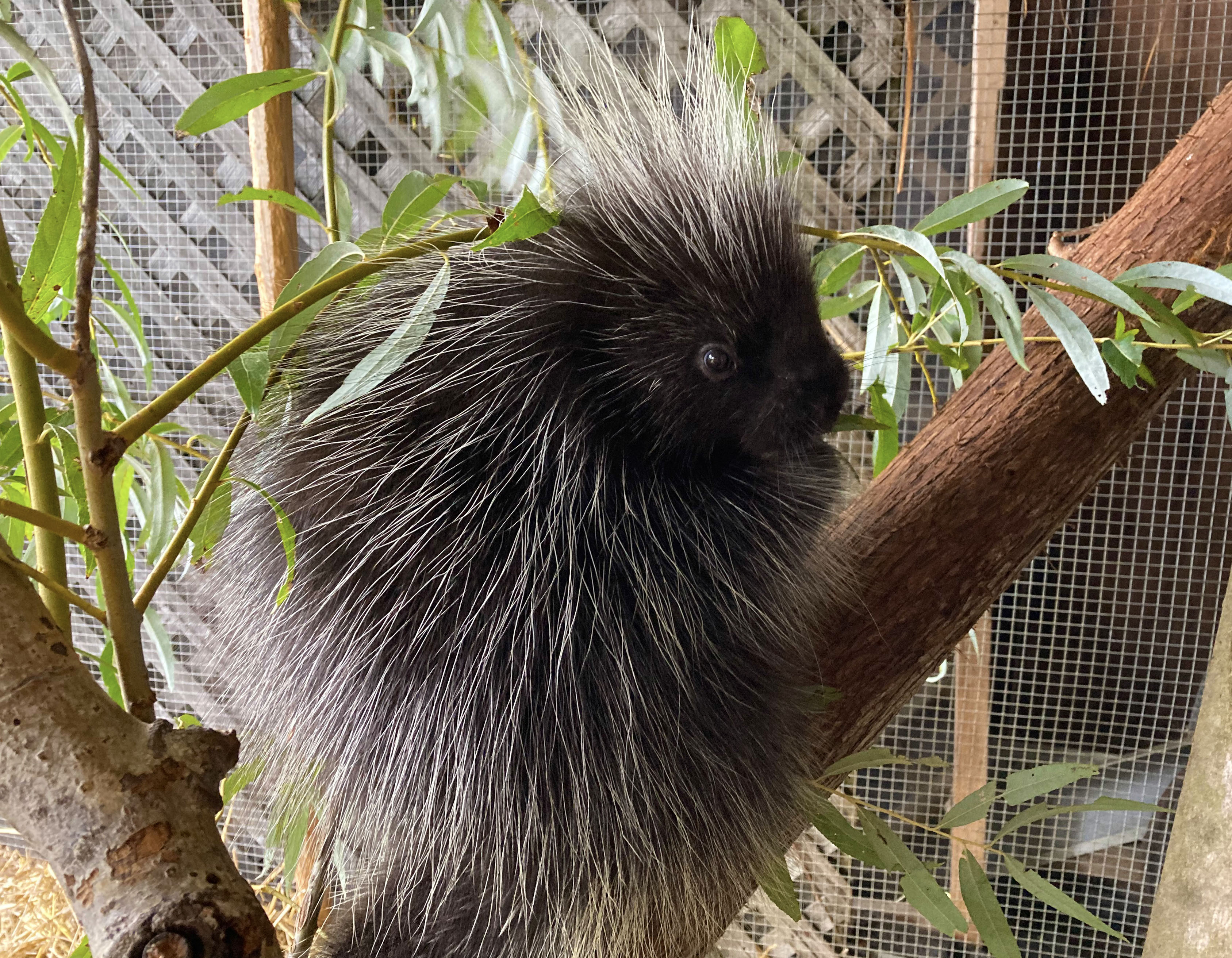 The porcupine is most well known for the close to 30,000 quills, which cover its body. A common error is that porcupines can throw or shoot their quills. These modified hairs are still a great defense mechanism, and their strong tail can be thrashed at a predator resulting in serious injury. When relaxed, the quills blend in well with the porcupine’s fur. However, when stressed or threatened, the quills are raised and very evident, some of which are over 3 inches long.