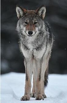 Species Information: The wolf has several common names, including “eastern timber wolf”, “grey wolf and “black wolf”. The wolf is about the size of a large German shepherd, but its legs are lankier and its chest is narrower. Males weigh from 27 to 36 kg (60 to 79 lbs), and northern wolves may be even heavier. Females are lighter by 5 to 7 kg (11 to 15 lbs) and have smaller frames. The southern boundary of the range corresponds to a line between the middle of Lake Simcoe and the northern part of Lanark County. Wolves are found of Ontario where there are large forests. They can appear in a variety of colours, from white to brown to black, but is most often grey. Gray wolves are the largest living wild canine species.